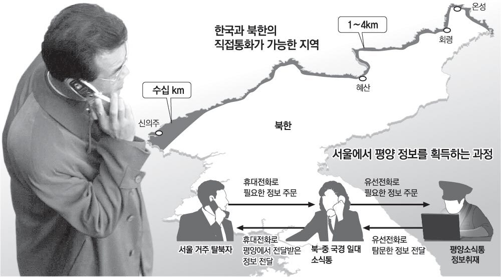 북한에 휴대전화를 들여보내고 통화비용을 지불하는 일은 대개 중국 조선족들이 돈을 받고 한다. 한국에 입국한 탈북자들은 탈북 과정에 중국에도 상당한 인맥을 형성하고 있다. 한국과의 통화는 대개 밤에 이뤄진다. 북한에서는 2000년 초반부터 개인 집에 유선전화가 본격적으로 도입됐다. 재작년 12월부터 시작된 휴대전화 서비스에는 현재 약 9만 명이 가입했다. 이런 유무선 전화들은 한국과의 직접 통화는 불가능하지만 평양을 포함한 내륙 깊숙한 곳의 정보를 시시각각 북-중 국경의 정보벨트에 전달한다. 북-중 국경에 있는 사람이 평양에 전화로 정보를 확인해 곧바로 한국에 전달할 수 있는 체계가 구축된 셈이다.